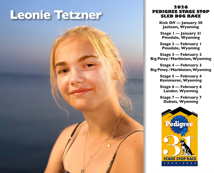 Fifteen-year-old Leonie was born into the sport, following her dad’s footsteps, and in Europe she’s a bit of media star, featured on radio, television, and in sports magazines. She was a handler for her dad in 2023 and 2024. Last year was her first time racing the Stage Stop. In 2023, she received the Susan’s Hope Award for Dog Care at the Fur Rondy. “Wyoming has beautiful scenery and is an amazing place to race with my dogs, our friends, and other mushers. I fell in love with nature the first time we came for the race,” she says.
