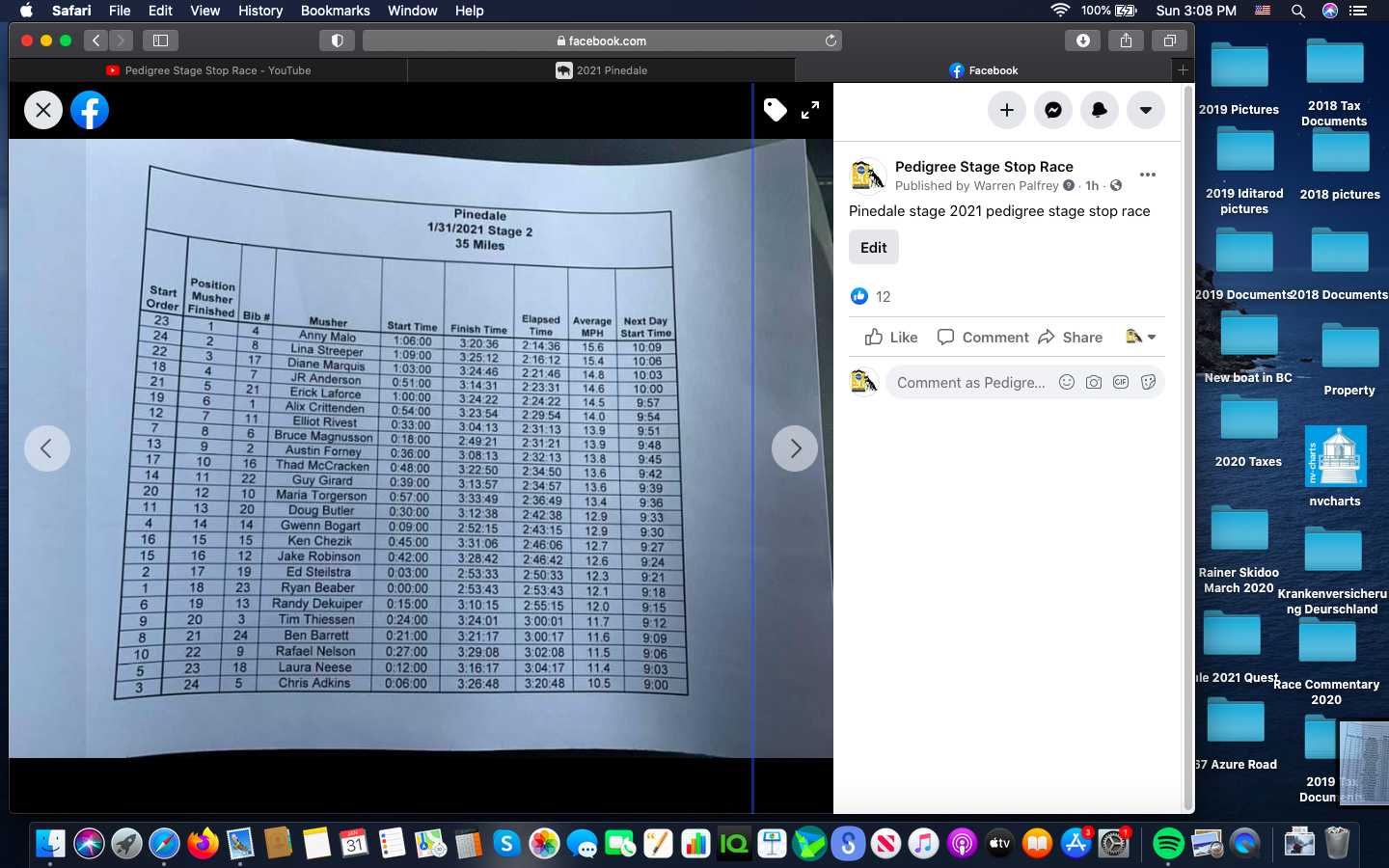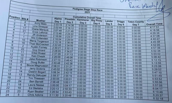 First up: We have a new overall leader. The yellow bib will be changing hands tonight in Kemmerer. Anny Malo had a heck of a run. She came in 1st in todays heat by 1hr and 36 minutes. With that she has an overall lead over Lina Streeper by 1min 5 sec. Those 2 ladies are duking it out, same as in the past 2 years. Each one having won the race twice in the past 4 years. VERY tight competition.