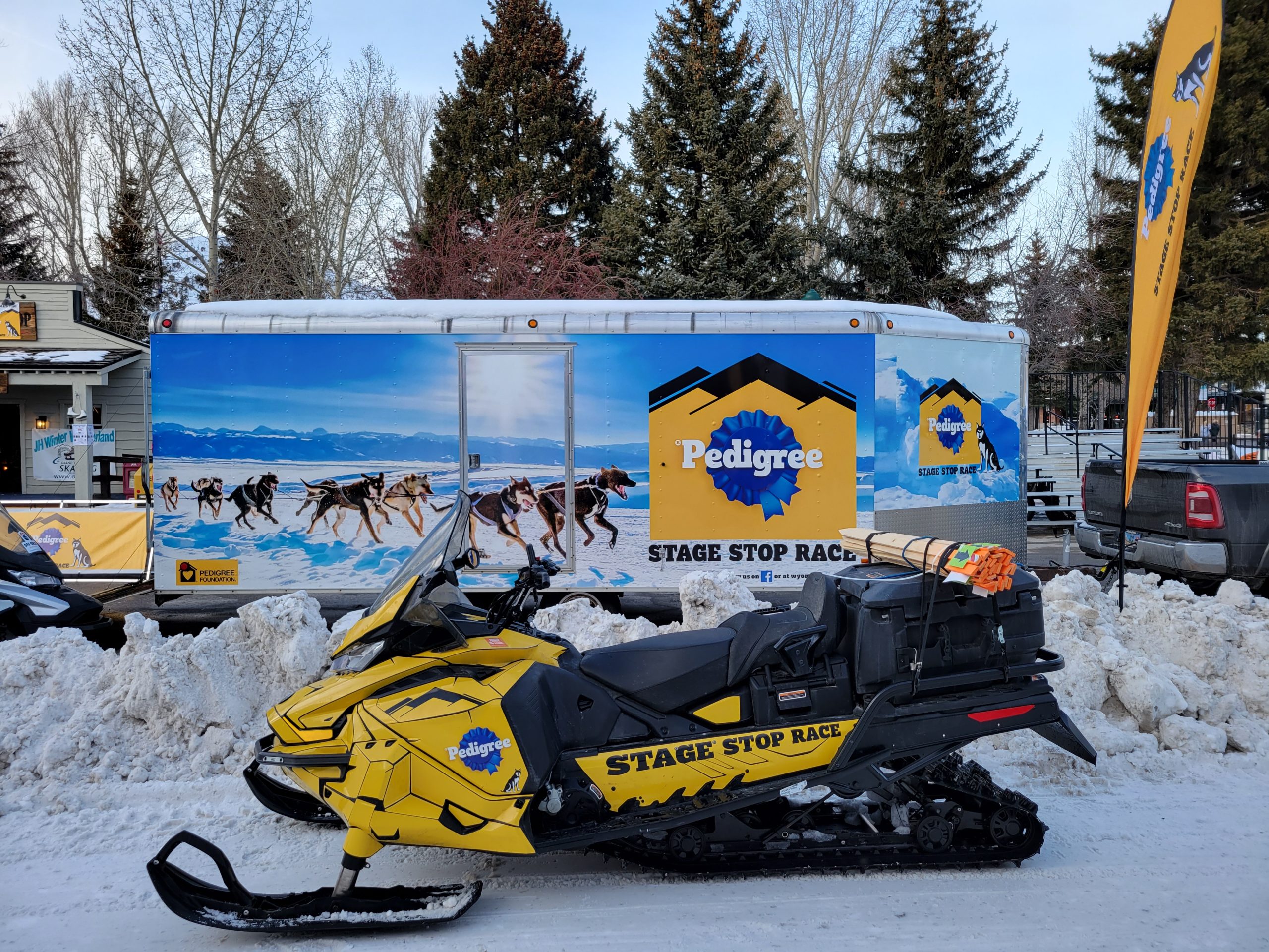 Parking Mushers is a tetris game in this tight parking lot. With the low snow, access for snowmachine tours is also fenced off. A few teams camped out here overnight like Bruce Magnusson, who’s team is run by Laura Bontager. Bruce joked: ” Last year we only had one off day, and that was the day we stayed at a hotel. ” Their trailer is set up quite nicely for camping, so are several others. The biggest rig on this years course by far belongs to French Swedish Mushers Remy Coste and Aurelie Delattre. Hopefully at some time I can get you a tour of their rig.