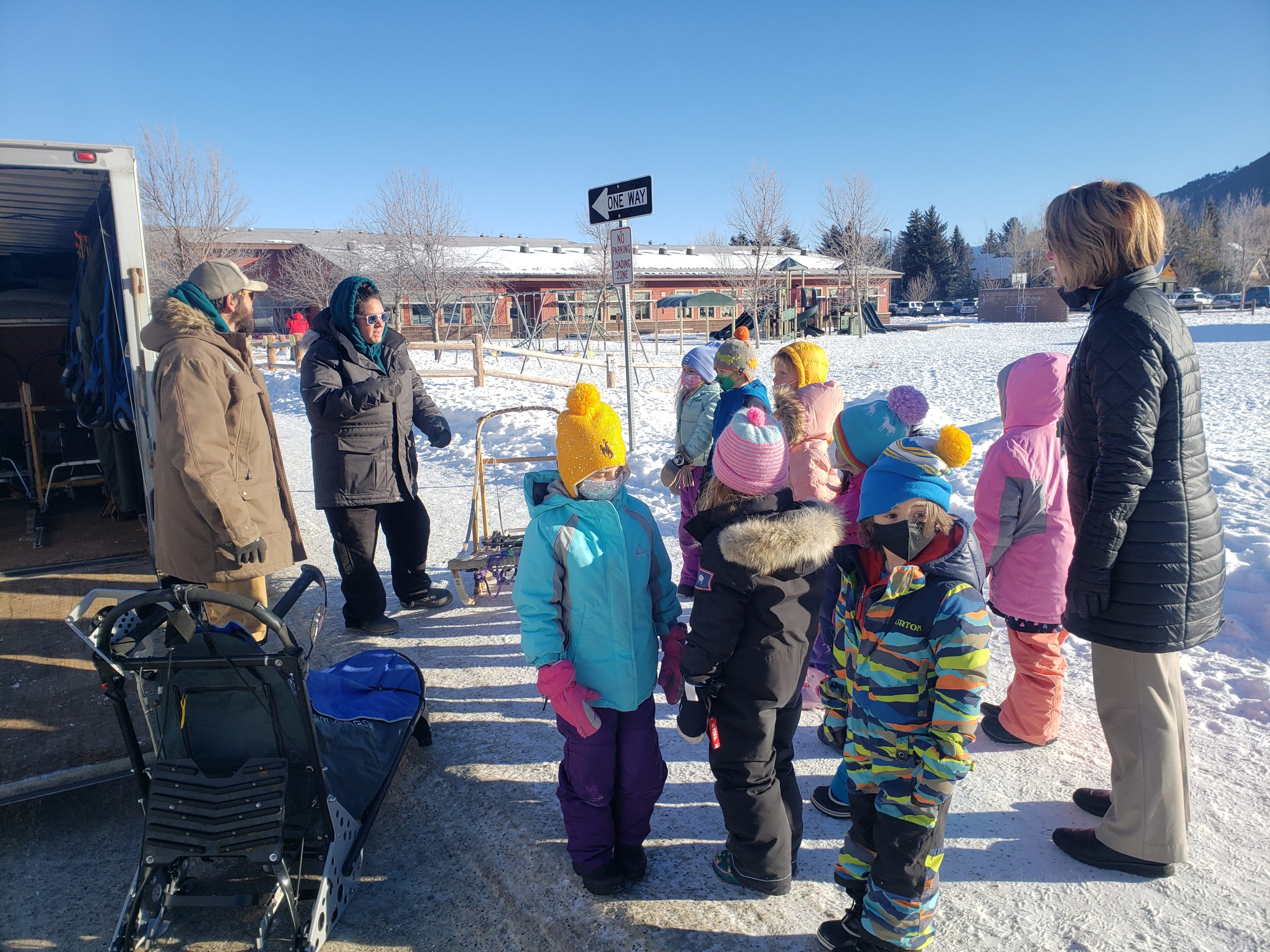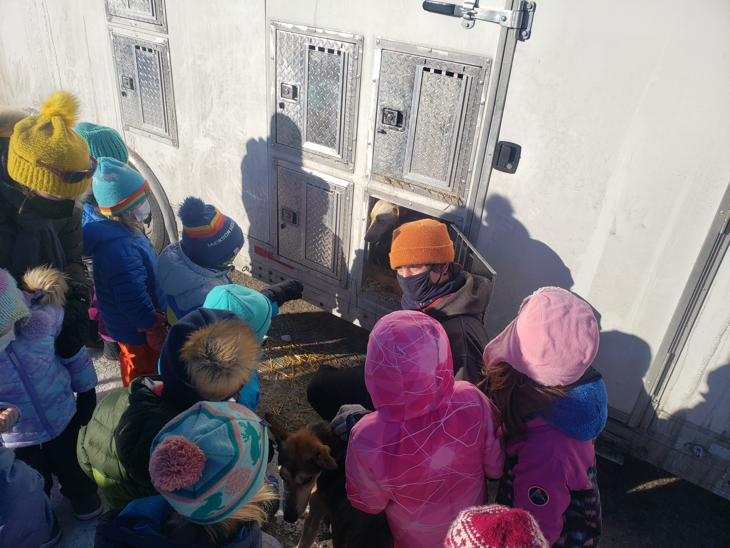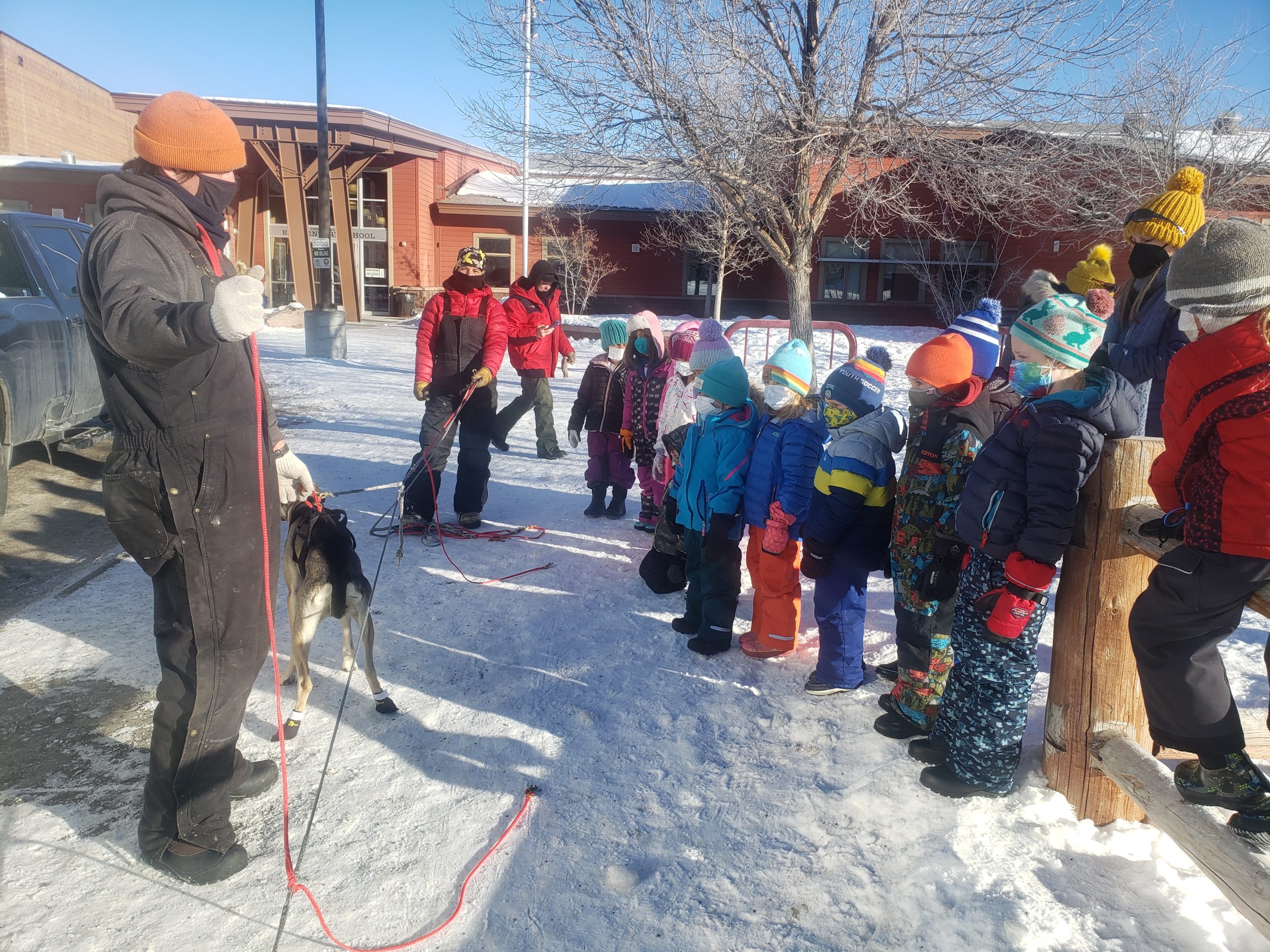 Over the past several days many Stage Stop Mushers have visited different schools throughout the State of Wyoming. This morning it was a local affair, here at Jackson Elementary School in downtown Jackson. 3 Large dog trucks and trailers were parked outside. Anny Malo, Cathy Rivest, Jake Robinson and Fernando Ramirez were helping each other to entertain various groups of children, all bundled up in winter gear. Here at the Pedigree Stage Stop we like to give back to each community for welcoming the race. Visiting with Sled Dogs is for sure a highlight for these children. Smiles all around.