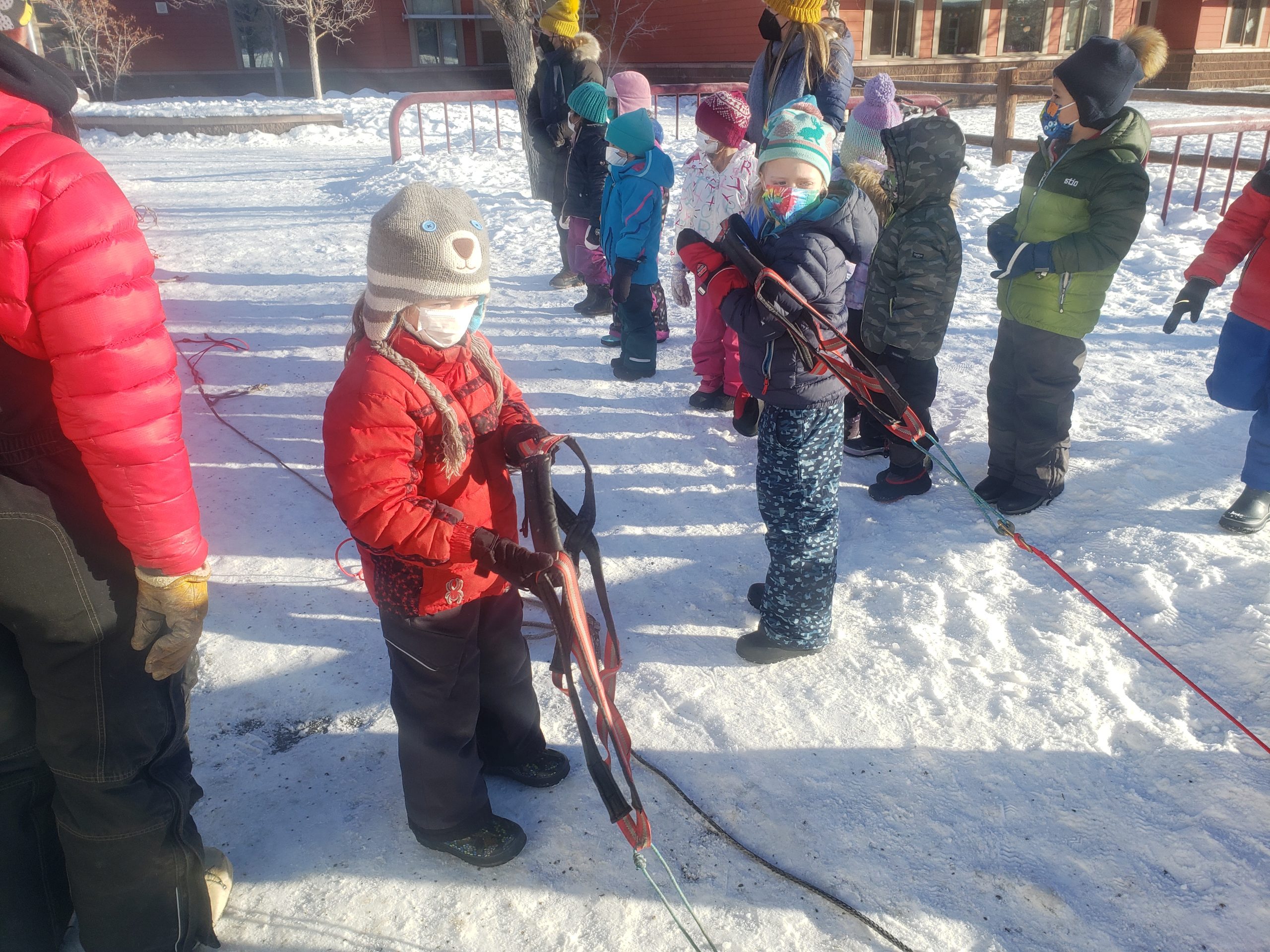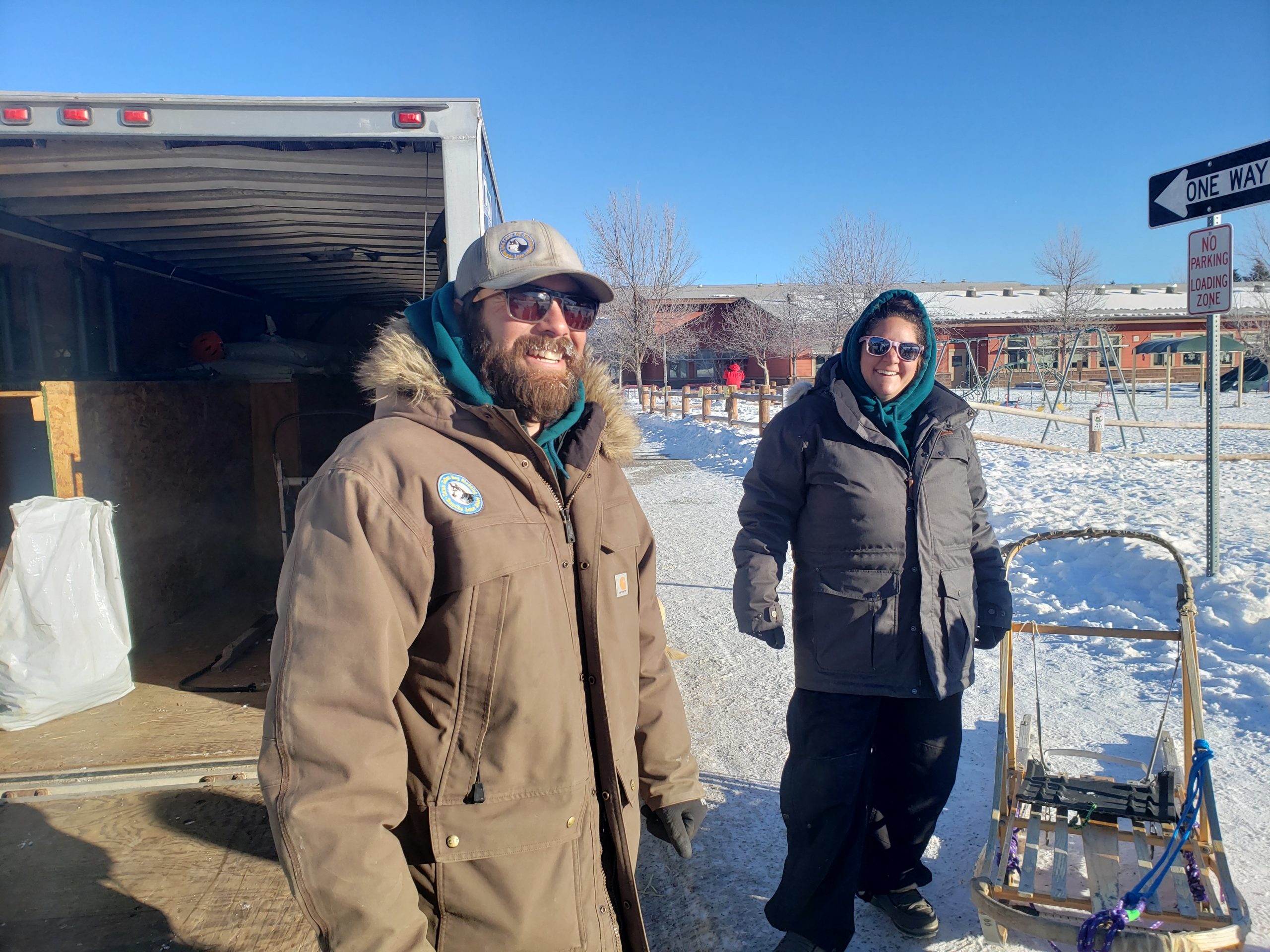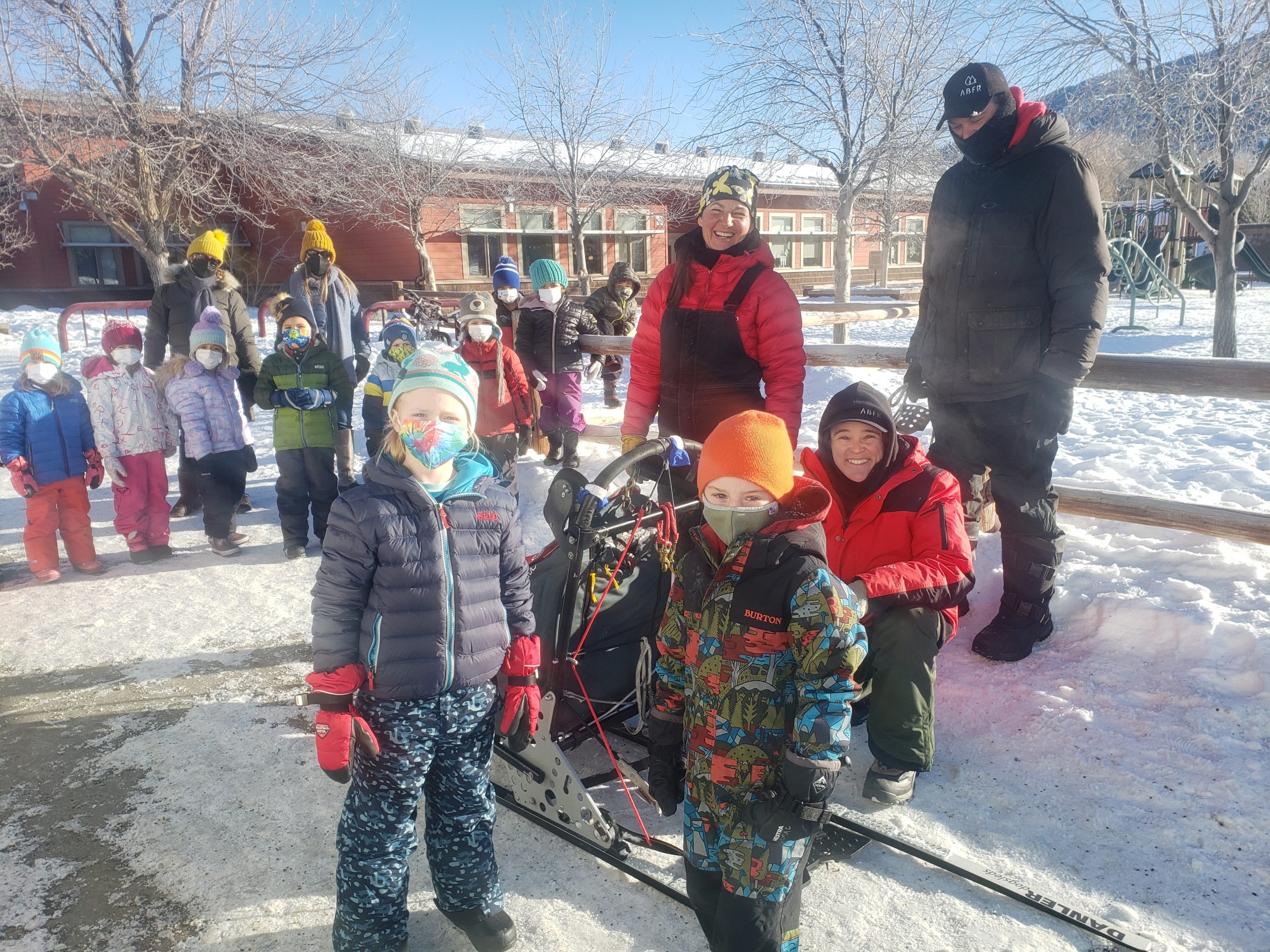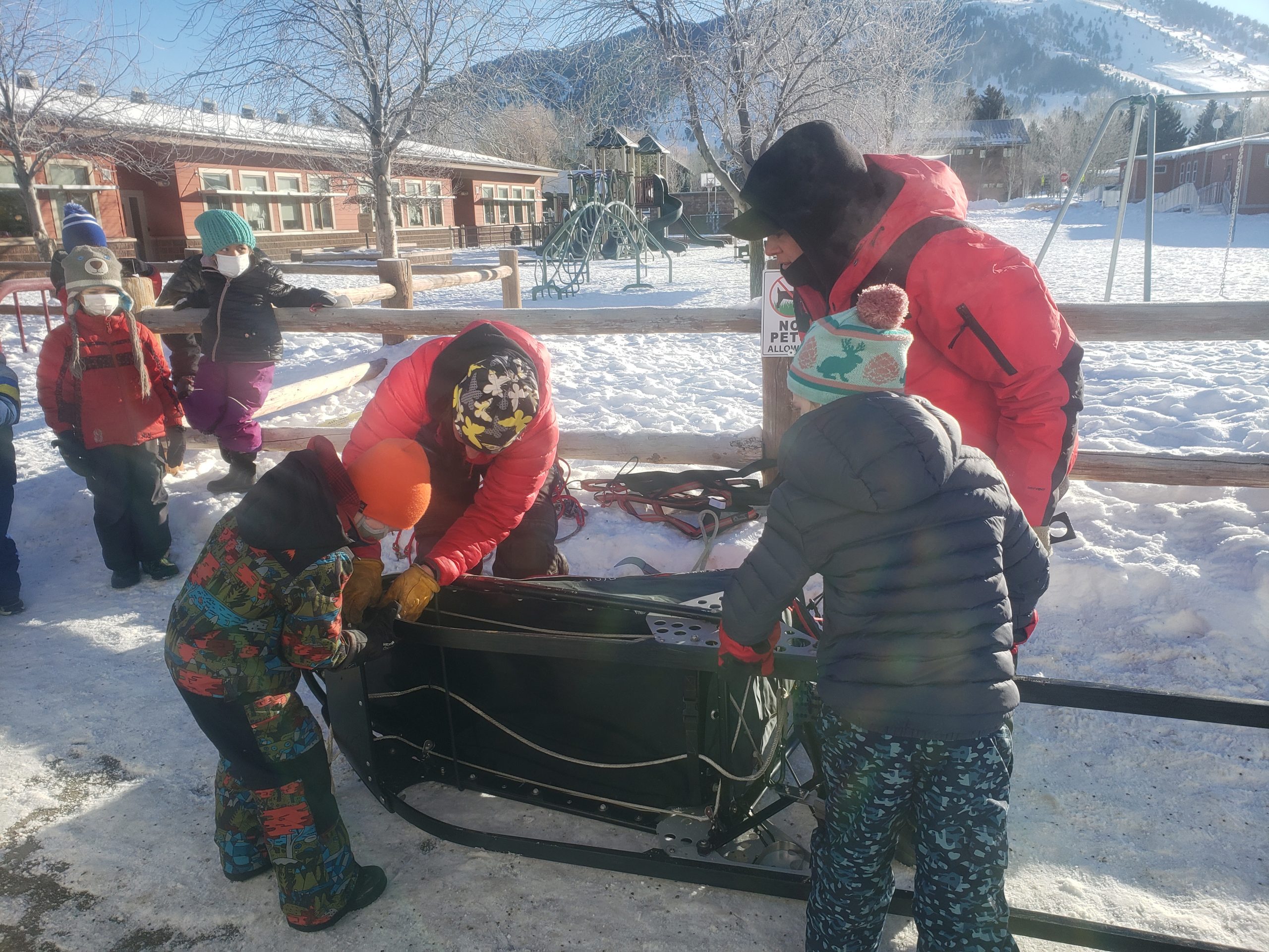 Over the past several days many Stage Stop Mushers have visited different schools throughout the State of Wyoming. This morning it was a local affair, here at Jackson Elementary School in downtown Jackson. 3 Large dog trucks and trailers were parked outside. Anny Malo, Cathy Rivest, Jake Robinson and Fernando Ramirez were helping each other to entertain various groups of children, all bundled up in winter gear. Here at the Pedigree Stage Stop we like to give back to each community for welcoming the race. Visiting with Sled Dogs is for sure a highlight for these children. Smiles all around.