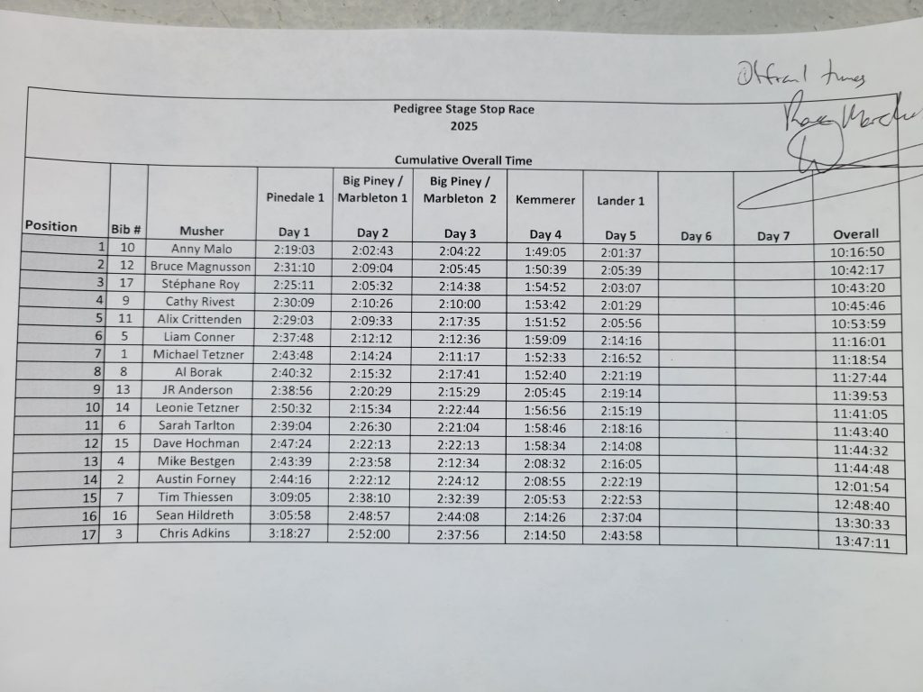 Overall Standings after Stage 5 in Lander Posted February 6, 2025 by Sebastian Schnuelle & filed under . Hello Pedigree Stage Stop Race fans, it has taken a bit longer than usual, here are the Cumulative times after Stage 5 in Lander and a few fun little videos: