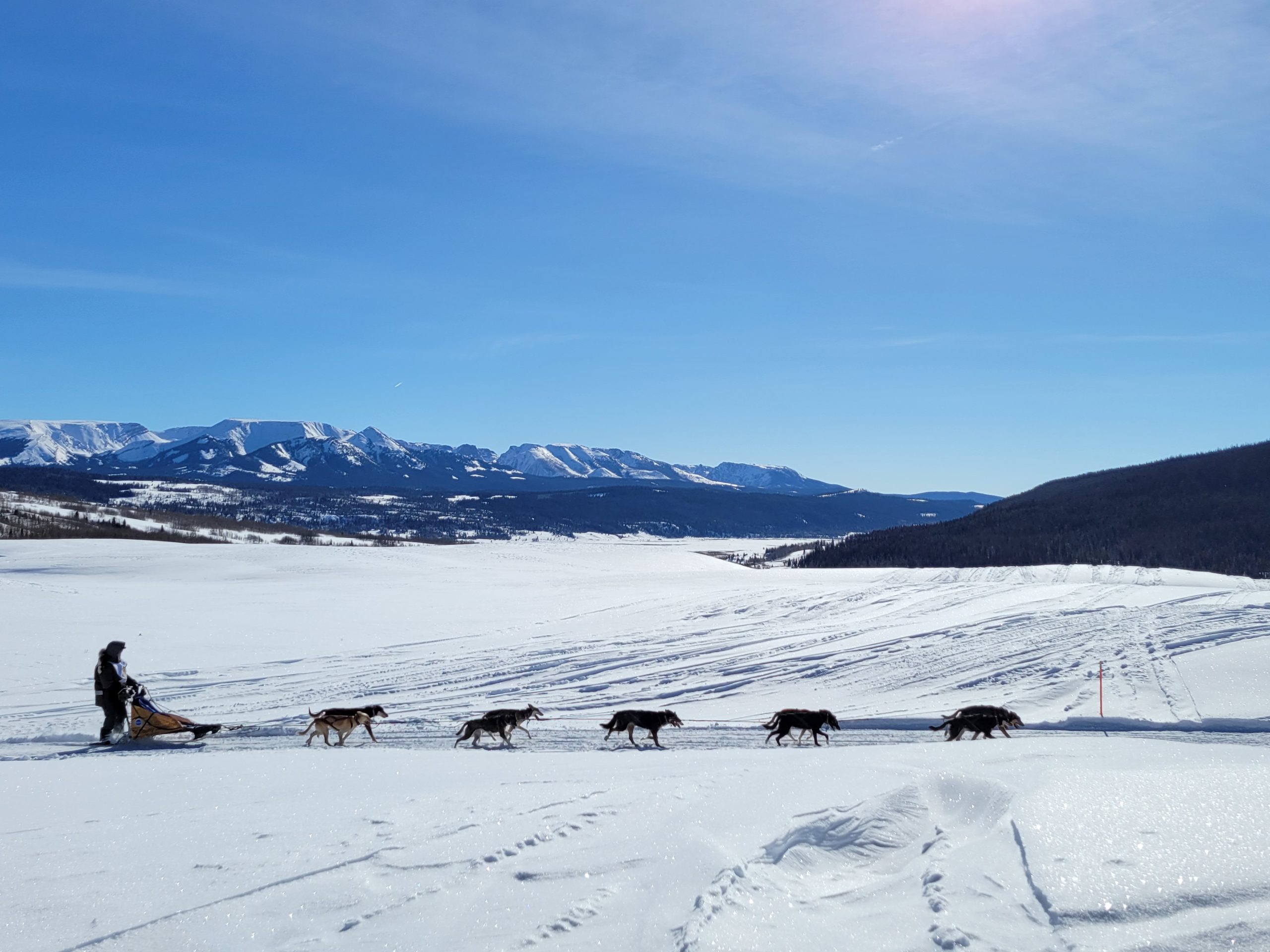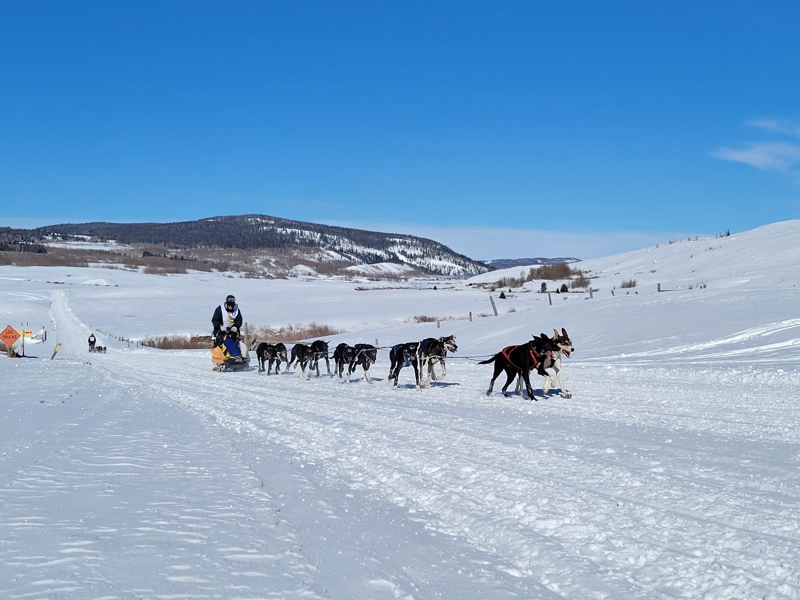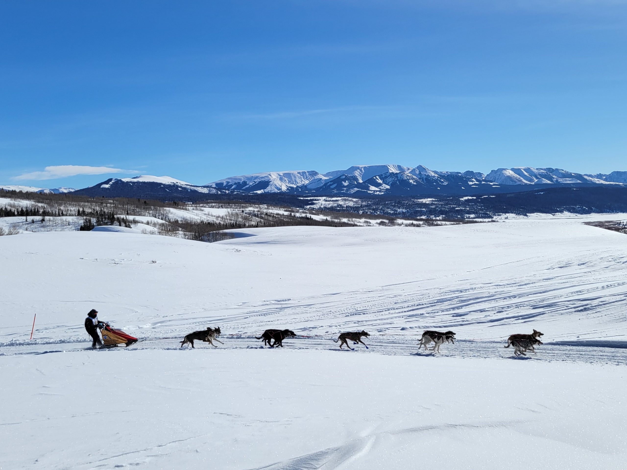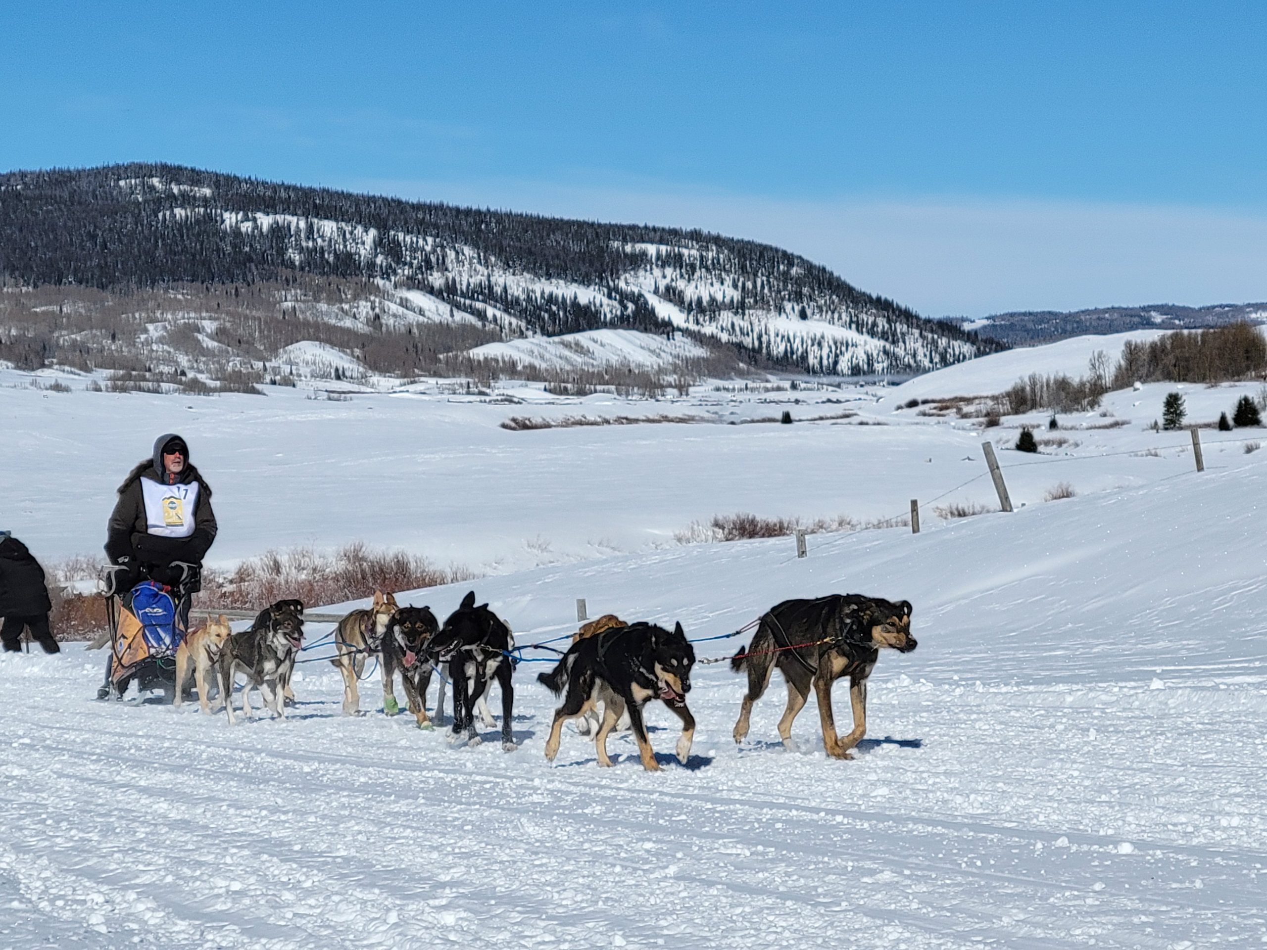 today in Pinedale saw racing at its best. Clear Skys, perfect temperatures at race start. And even once it did start warming up, there was a nice south breeze to cool down the dogs. The trail had already been groomed for Mondays originally planned stage. So with it getting re-groommed it was nice, hard and fast.