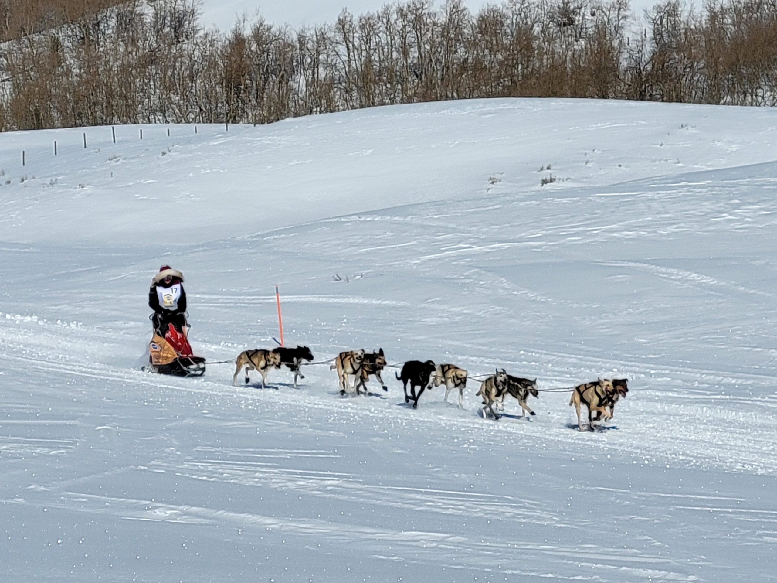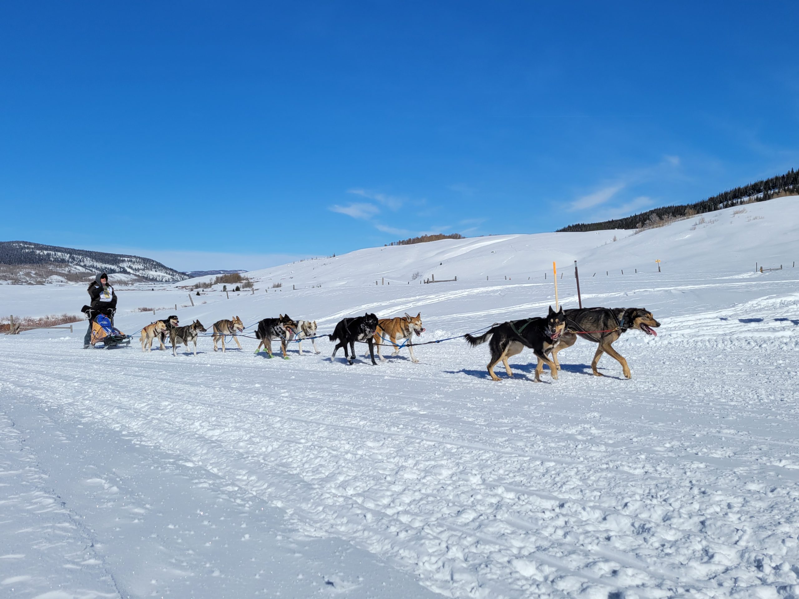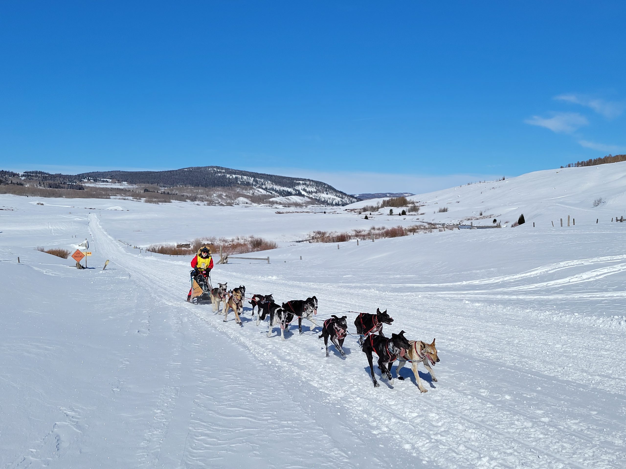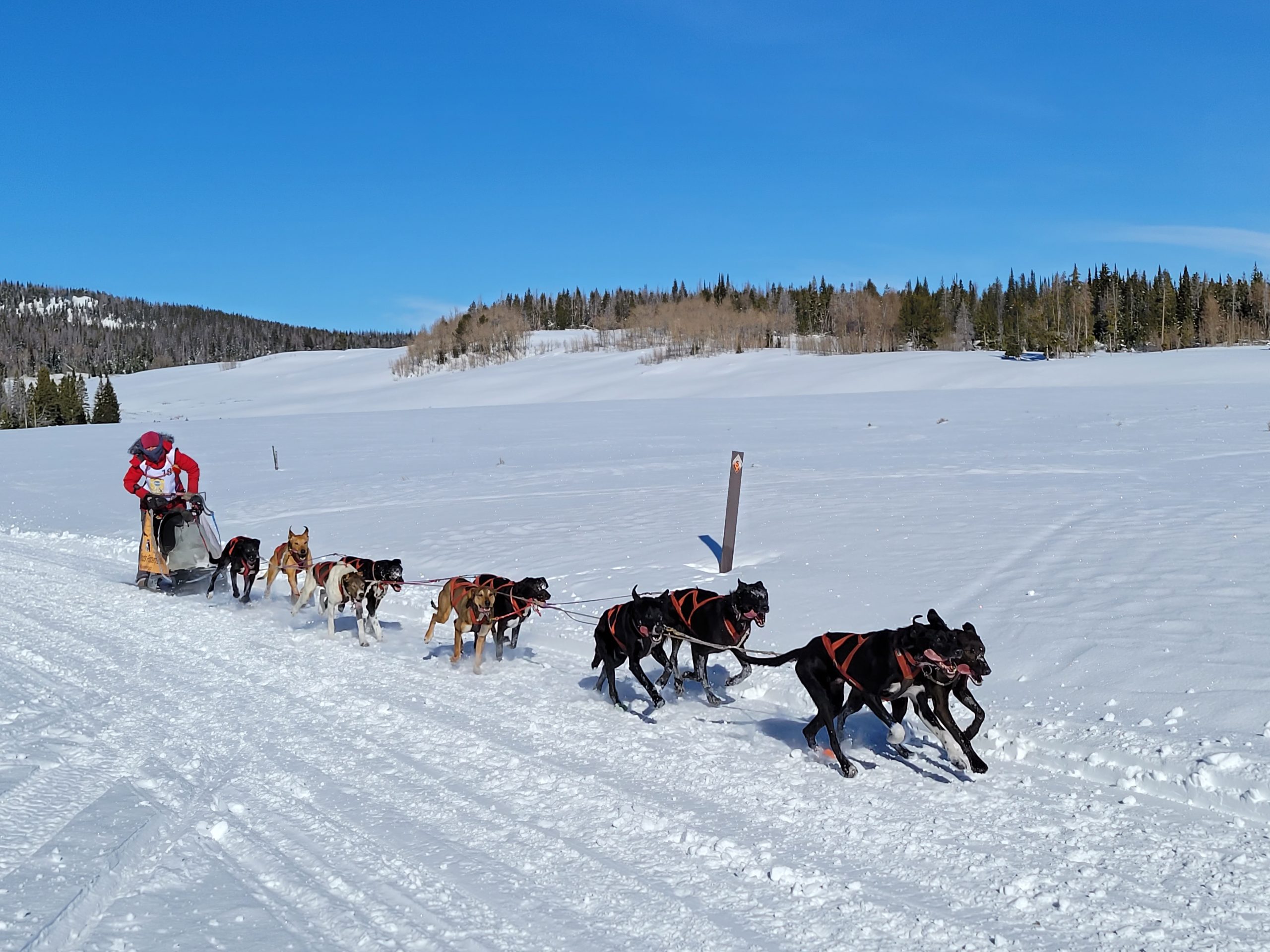 today in Pinedale saw racing at its best. Clear Skys, perfect temperatures at race start. And even once it did start warming up, there was a nice south breeze to cool down the dogs. The trail had already been groomed for Mondays originally planned stage. So with it getting re-groommed it was nice, hard and fast.
