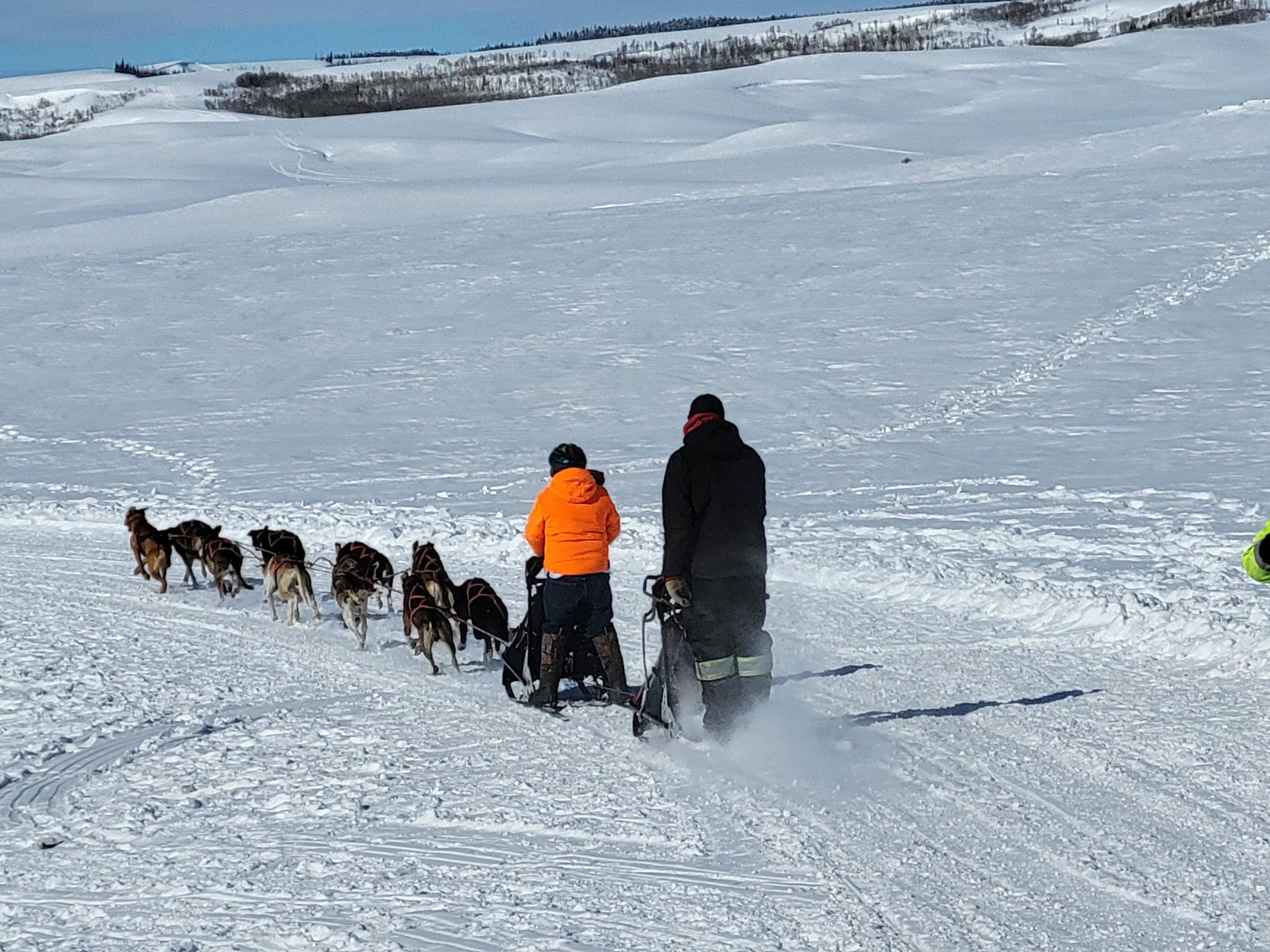 After the Pinedale Stage Marco Rivest gave his Junior Musher from Kemmerer his Sled Ride, as he missed it during the ceremonial Start last Friday in Jackson, as the roads were closed due to impassable winter conditions. Big smiles all around! Even better, instead of sitting in the sled as at the ceremonial start, he got to ride his own sled!