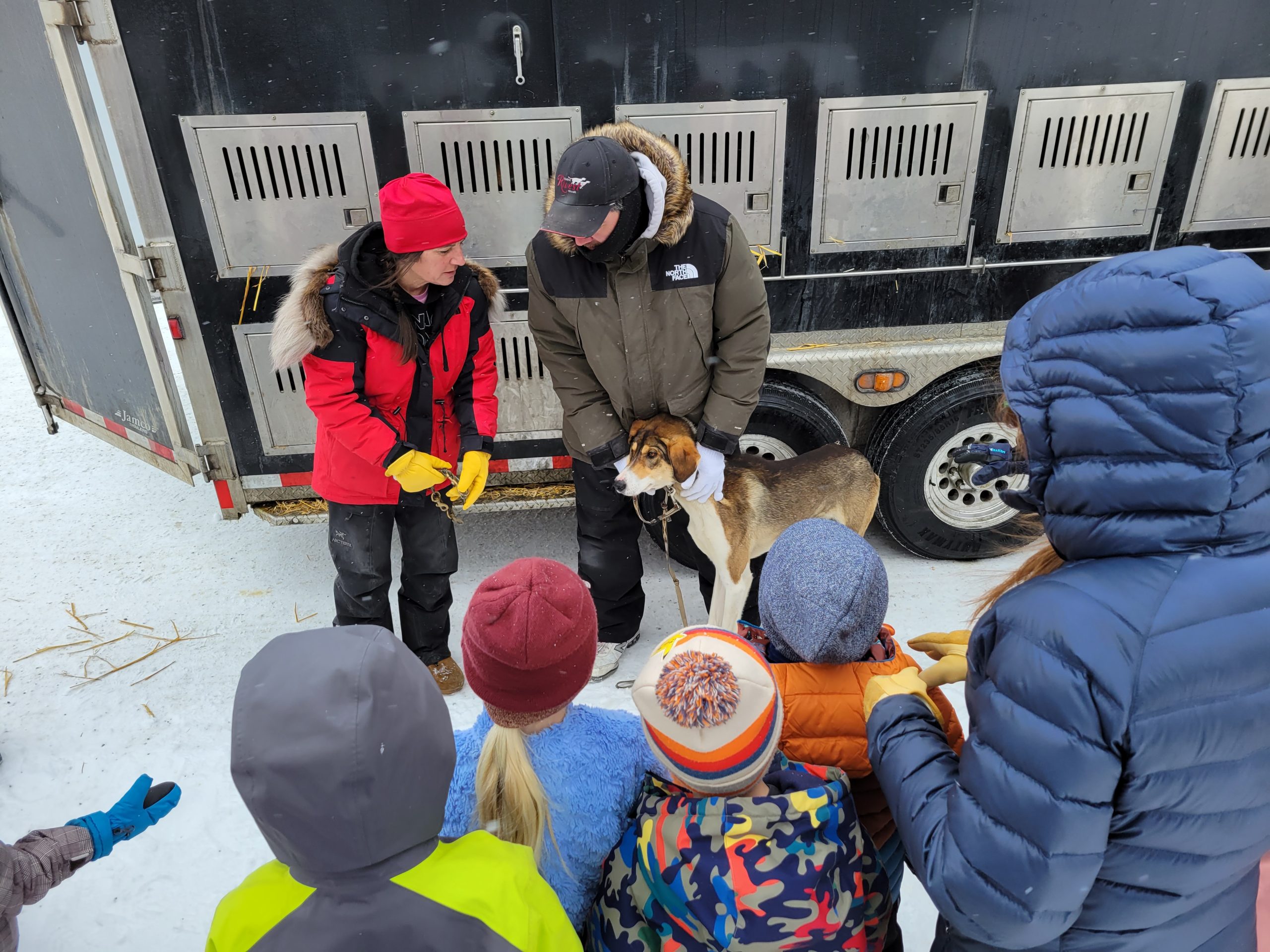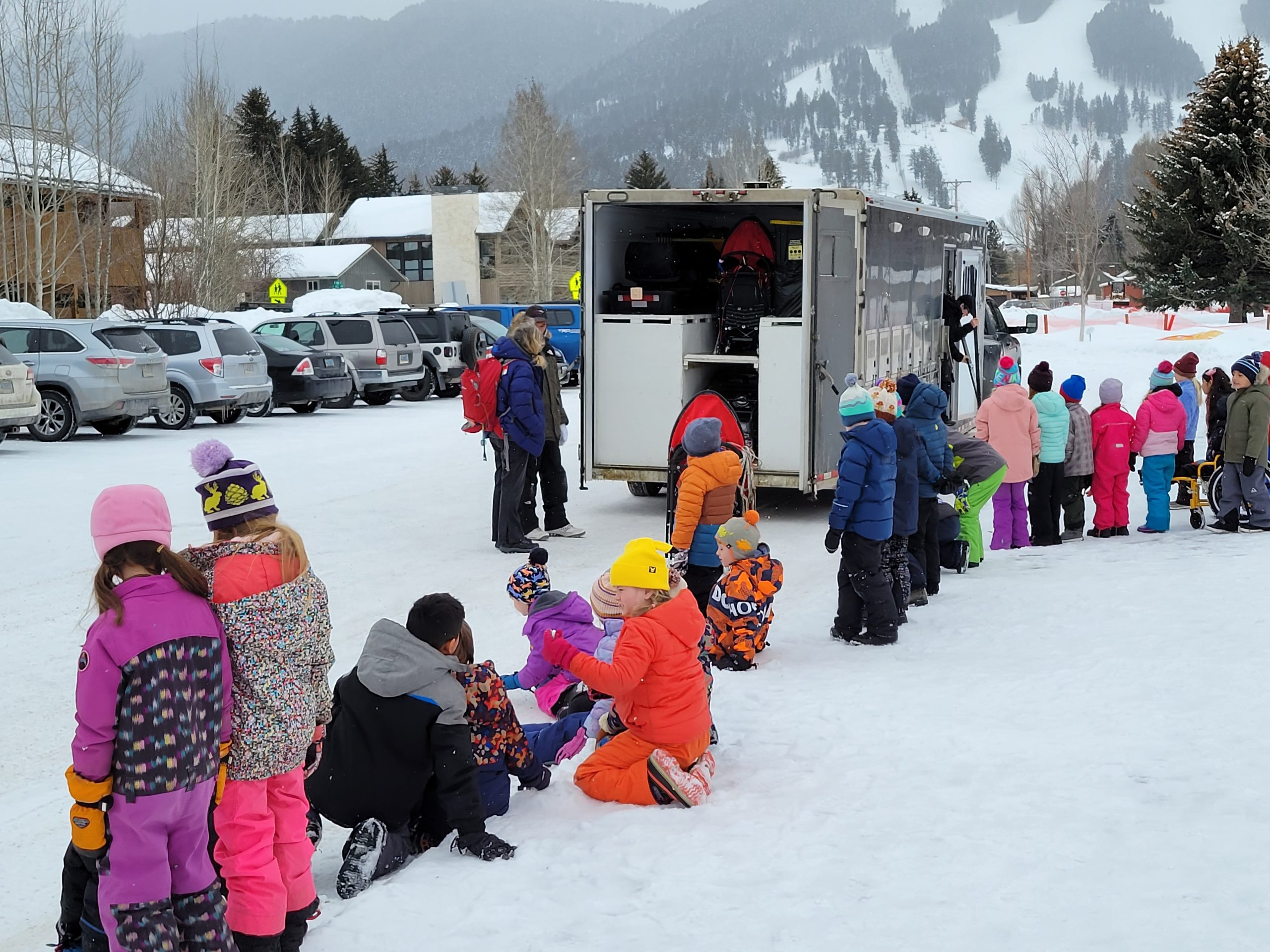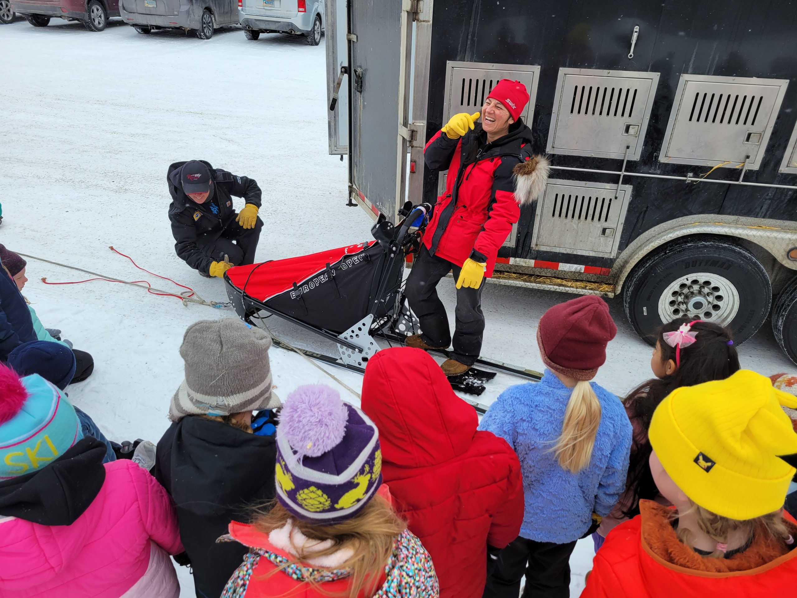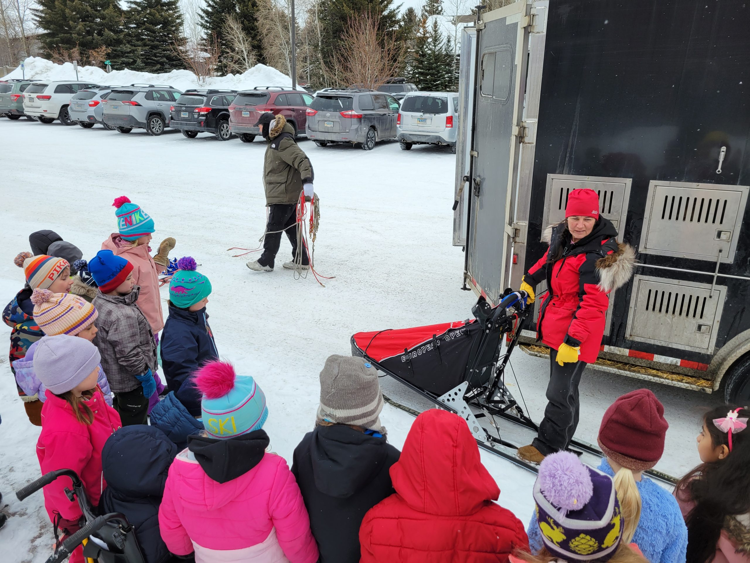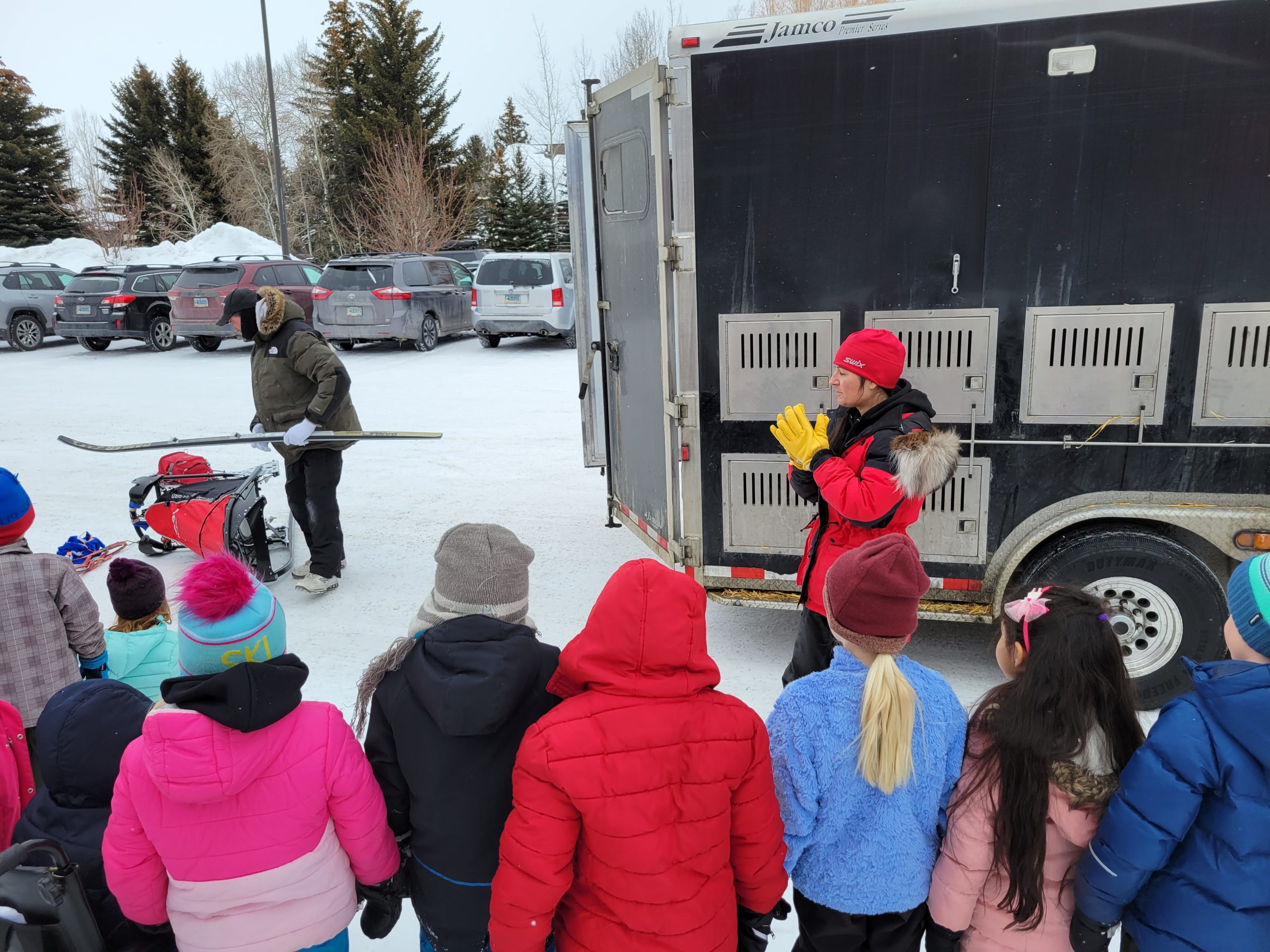 Yesterday saw many Mushers give school presentations throughout the States of Wyoming and Idaho. Those visits give great joy to the different classes. From listening to dogs hearts through a stethoscope, to pulling a sled, petting dogs and lots and lots of questions. Here a selection of pictures. Next up is the Vet Check beginning at the Delony Parking lot in downtown Jackson at 9 a.m. That sees typically quite a few visitors too.
